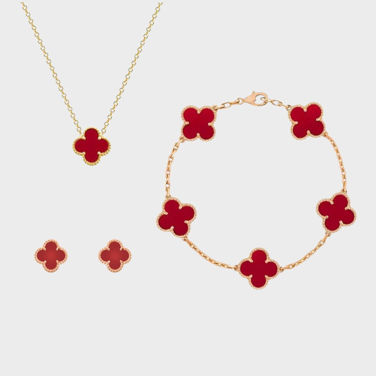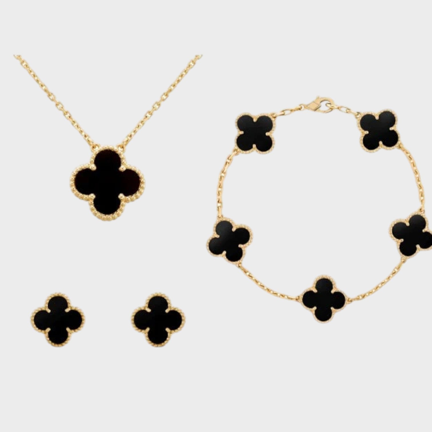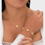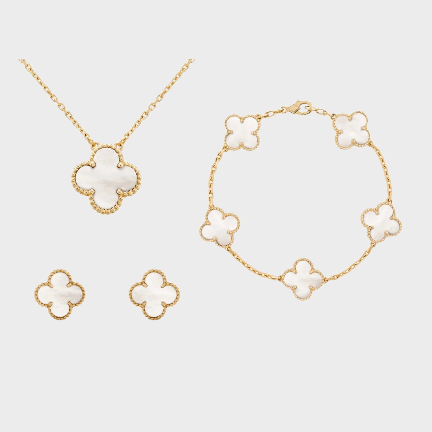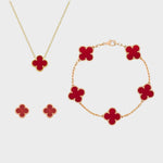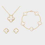 Ce magnifique ensemble de bijoux, comprenant un collier, un bracelet et des boucles d'oreilles, allie sophistication et charme. Les motifs de trèfle à quatre feuilles symbolisent la chance et la beauté, ajoutant une touche raffinée à votre look.