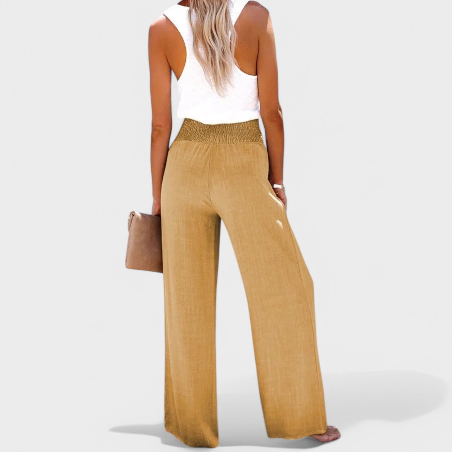 La taille élastique smockée avec un détail de boutons frontaux met en valeur votre silhouette de manière moderne et naturelle. Parfaits pour être associés à des tops courts ou des blouses fluides, ces pantalons sont une pièce clé pour des looks d'été polyvalents et sophistiqués.