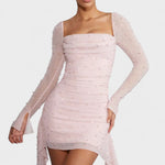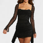 Les manches en tulle scintillant ajoutent légèreté et glamour, tandis que le détail asymétrique de la jupe crée mouvement et audace. Idéale pour les fêtes, les sorties nocturnes ou les événements spéciaux, elle n'est pas qu'un simple vêtement, mais une expression d'attitude.